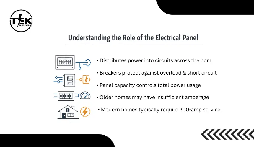 Panel capacity determines how much electrical load the system can safely distribute at one time. When connected appliances exceed that capacity, breakers trip to prevent overheating.