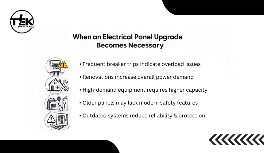 Frequent breaker trips, flickering lights, limited circuit space, or plans to install high-demand appliances are strong indicators that capacity may be insufficient.