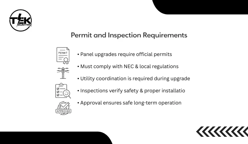 Local building departments review upgrade plans to ensure compliance with the current edition of the National Electrical Code (NEC), proper conductor sizing, grounding methods, and overcurrent protection standards.